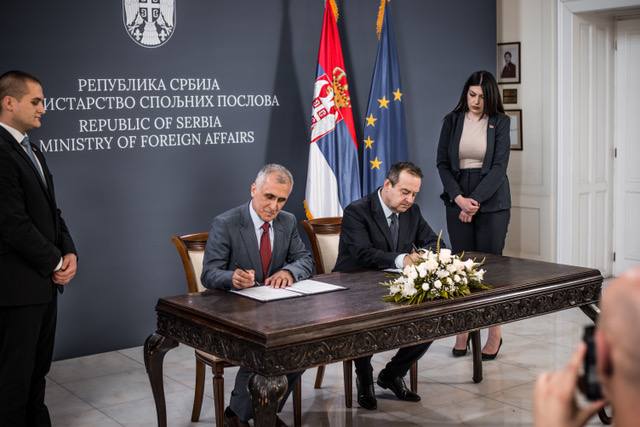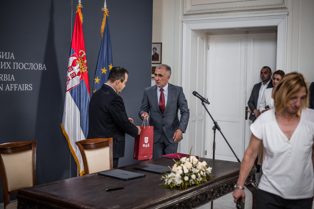 Sporazum su potpisali dekan fakulteta i ministar spoljnih poslova, g. Ivica Dačić. U kraćem obraćanju nakon potpisivanja sporazuma, ministar je istakao značaj institucionalizacije saradnje dveju ustanova, koji će se ogledati u budućem stručnom usavršavanju mladih kadrova. Dekan fakulteta se u ime svih zaposlenih i studenata fakulteta zahvalio ministru i ministarstvu na zasnivanju saradnje, posebno napominjući značaj koji će praktična rad studenata u Ministarstvu spoljnih poslova imati za stručna usavršavanja i buduće karijere studenata fakulteta.